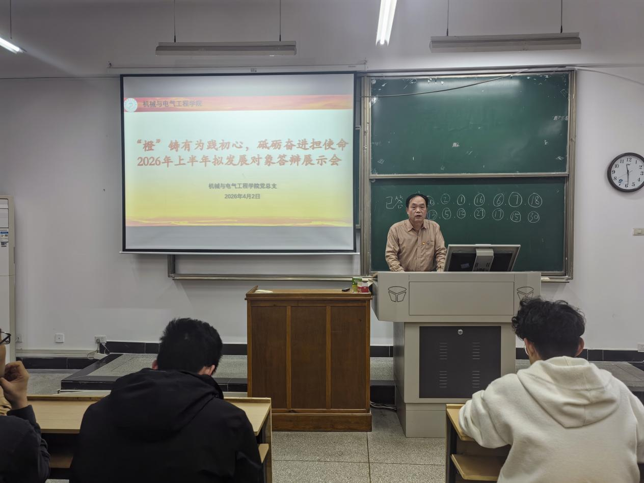 (通讯员:毛礼娜)为严把党员发展入口关,切实提升党员发展质量,4月2日,机械与电气工程学院党总支于3503举办“‘橙’铸有为践初心,砥砺奋进担使命”2026 年上半年拟发展对象答辩展示会。学院正处级组织员何秉忠、机械与电气工程学院领导班子、各党支部书记、党务干事、学生党员代表担任本次答辩评委。